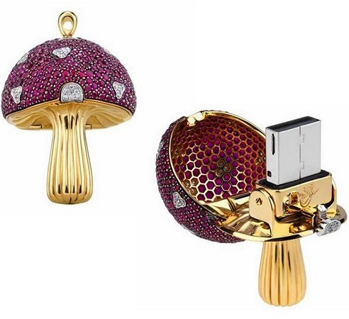 Це не тільки гарний дизайн, але також дуже дорогі матеріали, рожеві і червоні рубіни, смарагди, сапфіри і алмази. USB флеш-накопичувач Магічний Гриб створений швейцарською ювелірною компанією La Maison Shawish, оригінальний дизайн заснований на знаменитій історії «Пригоди Аліси в країні чудес» Льюїса Керрола.